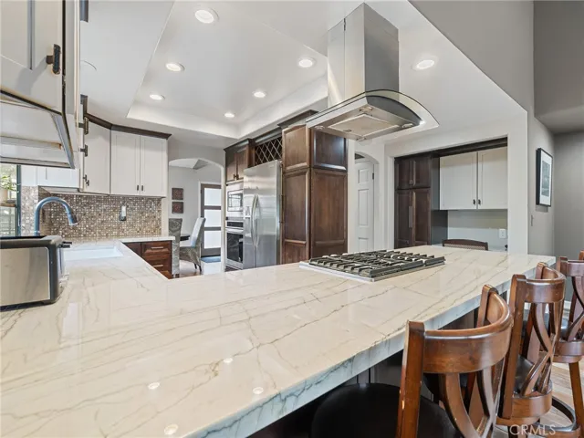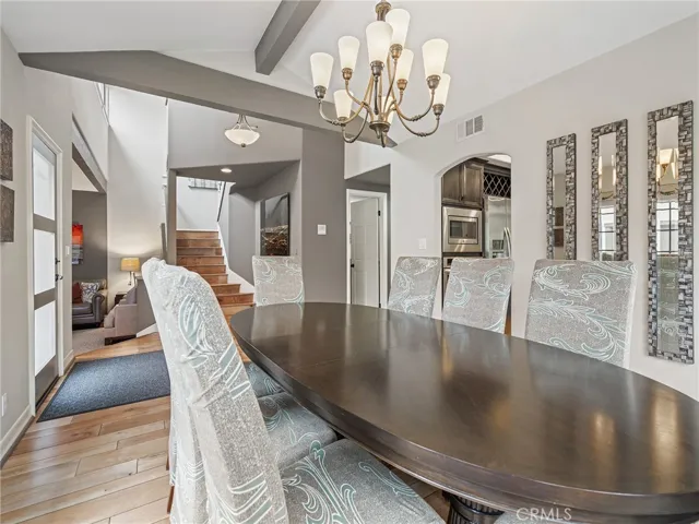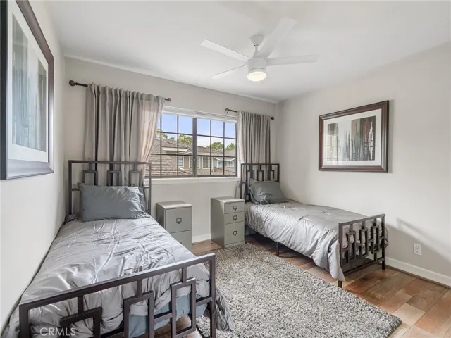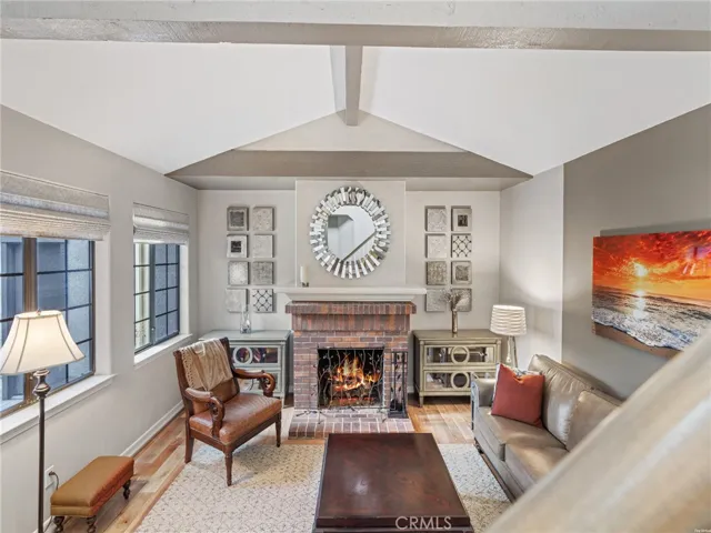 Ideally situated within the community of the Manhattan Village, this property is tucked away on a cul-de-sac with privacy. This highly sought after plan 8 townhome features a main floor primary suite with a walk-in closet, vaulted ceilings, and French doors leading out to the patio. The updated kitchen is equipped with a built-in 6-burner gas range, wine fridge, and a large breakfast bar open to the family room. A built-in desk and additional cabinet space complement the kitchen in modern design. A moody living room with fireplace, a large sunlit dining room and guest bathroom complete the first floor. The second level features two bedrooms and a bathroom plus a loft with a built-in workspace overlooking the first floor with second level windows that have views of the lush neighborhood. With only one shared wall, there is an abundance of windows surrounded with greenery and there is newly installed central air conditioning. The two-car garage is has an epoxy finish with washer and dryer included. Convenient guest parking is abundant on Nantucket and it has an easy walking path to the community pool, numerous spas, and well-lit and paved sidewalks. The 24 hour security includes the front gate guard, two additional residents only gates (including one at the Village mall entrance) and an overnight roaming guard.