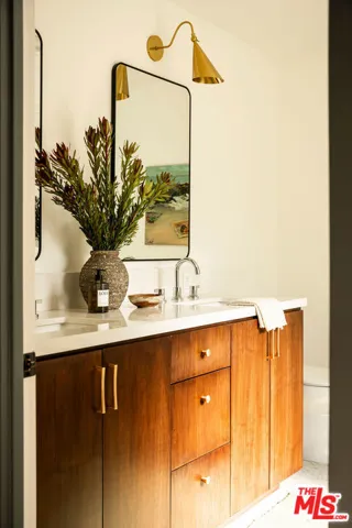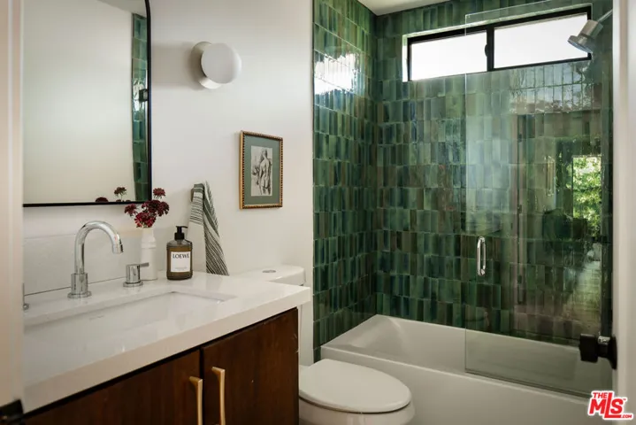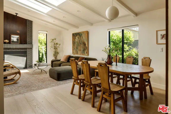 Located in the Franklin Hills neighborhood of Los Feliz, this renovated Mid-Century-inspired 3 bed, 2.5 bath residence sits privately behind hedging and gates within the coveted Franklin Elementary School district (per LAUSD). Framed by sculptural cacti and drought-tolerant landscaping that echo the home’s clean architectural lines, the property offers a thoughtful blend of modern, elevated design and easy California living. Inside, vaulted beamed ceilings and new Velux skylights with solar-powered shades fill the home with natural light, highlighting its open layout and curated finishes. The living room serves as the heart of the home, anchored by a chic brick fireplace and picture windows overlooking the front yard. The space flows effortlessly into the dining area set against a beautiful walnut accent wall, where a Herman Miller George Nelson Bubble Lamp hangs overhead — an ideal setting for both lively dinner parties and quiet evenings at home. The adjacent kitchen pairs warm walnut cabinetry with a glazed tile backsplash, stainless steel appliances, a large pantry, and a peninsula with bar seating. A stylish breakfast nook sits beneath another Herman Miller pendant, while a charming powder room wrapped in striped Sandberg wallpaper is perfect for guests. Just off the breakfast space, sliding doors open to a private patio, creating an easy connection for outdoor relaxation and entertainment. The home offers three bedrooms, including a spacious primary suite with vaulted beamed ceilings, a generous walk-in closet, and direct access to the backyard. The spa-inspired bath includes terrazzo tile floors, a dual vanity, a soaking tub, and a walk-in shower. Two guest bedrooms with skylights, a beautifully designed hall bath with statement tilework, and a spacious laundry room with a sink complete the home’s thoughtful layout. The property is entirely fenced and gated, with several outdoor areas including a back grassy lawn and a paver-stone patio, perfect for dining under the stars. An oversized two-car garage with an EV charger and a gated driveway provides convenience and secure parking. Ideally situated on the cusp between Silver Lake and Los Feliz, the home is a short distance to the commercial offerings on Hyperion Avenue — Speranza restaurant, Trader Joes, Gelsons, Rodeo Fitness – and the vibrant shops and restaurants of Los Feliz Village — including All Time, Maru, MUD, and Little Dom’s — plus the hiking trails and open space of Griffith Park. Private, chic, and ideally located, this stunning residence showcases thoughtful design and the best of Eastside living.