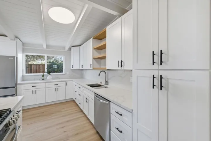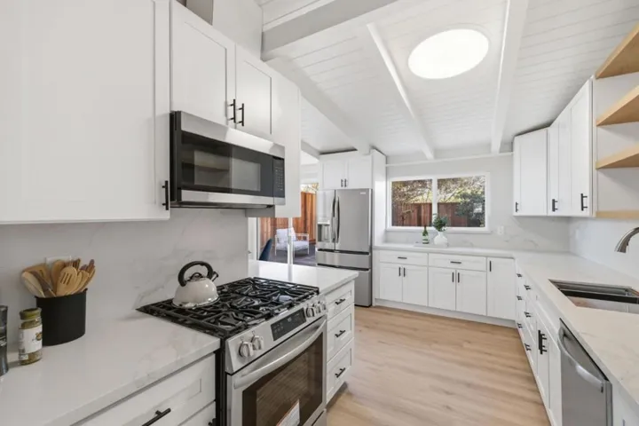 Not just a house, but a Home! Light-filled and updated home with mid-century modern architecture. New quartz countertops and tall cabinets in the kitchen. All new appliances included. Newer double pane windows, new doors, and new SPC Vinyl flooring throughout. Insulated roof and central heat pump (energy-efficient heating and cooling), less than 1 year old. Updated bathrooms. Very private backyard due to the outbuilding, taller fencing, and mature landscaping, which includes fruit-bearing pomegranate and Meyer lemon trees. The efficient floor plan is surprisingly spacious, however, additional room is available in the 10 x 12 Tuffshed office, upgraded with concrete fiberboard siding, finished & insulated interior walls, windows, skylights, and electrical. And…we have a garage that is actually still a garage! The location has minimal traffic compared to other streets in the area due to the “L shaped” street. Pride of ownership shows. Make this YOUR next HOME!