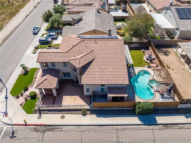 Welcome to this beautifully maintained and spacious two-story POOL home on a desirable corner lot, featuring 4 bedrooms, 4 full bathrooms, an upstairs loft, and a 3-car garage. This versatile floor plan includes a downstairs bedroom and full bathroom, perfect for guests, extended family, or multi-generational living. Step inside to soaring ceilings and an open, light-filled layout with formal living and dining areas, plus a large family room with a fireplace that flows seamlessly into the spacious kitchen. The kitchen offers granite countertops, a center island, abundant cabinet space, and plenty of room for cooking and entertaining. Additionally, the downstairs area includes a bedroom, a full bathroom, an indoor laundry room and direct access to the garage. Upstairs you’ll find a generous loft with its own private balcony patio, ideal for a second living room, game room, or home office. One upstairs bedroom also features its own private bathroom and balcony, a rare and desirable feature that adds extra convenience and outdoor space. The primary suite is oversized and includes a spacious bathroom with dual sinks, soaking tub, separate shower, and walk-in closet. The fourth bedroom is generous in size and shares a hall bathroom with the loft. Step outside to your backyard retreat, which features a heated pool and spa, a covered patio, a pergola sitting area, and a grassy yard perfect for entertaining or relaxing. The corner lot provides extra privacy and curb appeal, while the 3-car garage offers plenty of space for vehicles, storage, or toys. This home also includes solar with a low monthly payment, helping keep energy costs down while enjoying all the benefits of a larger home. Conveniently located just minutes from Costco, Victor Valley Mall, Home Depot, shopping centers, restaurants, and major commuter routes. Don’t miss this rare opportunity to own a spacious pool home with a downstairs suite, loft, multiple patios, and 3-car garage!