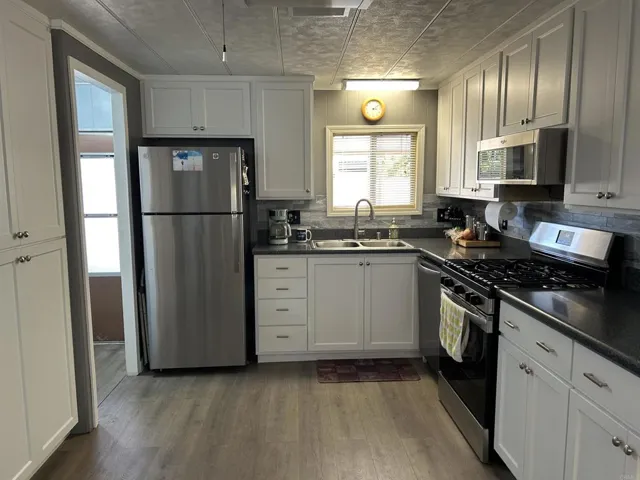 No Space Rent in a Resident-Owned 55+ Community! This move-in ready corner-lot home offers affordable homeownership in desirable North County. The spacious layout includes a bright sunroom, fresh new interior paint, and new flooring throughout. The upgraded kitchen features modern cabinetry, with refrigerator, washer, and dryer included for added convenience. Additional upgrades include a new water heater, updated primary bath vanity, and a guest bathroom with walk-in shower and newer vanity. Enjoy low-maintenance landscaping, perfect for easy living. Located in Vista Village, a welcoming and active senior community offering exceptional amenities including a clubhouse, heated saltwater pool, spa, fitness room, billiards, dog park, and RV parking. The low HOA of $355/month includes water, trash, cable, and internet, providing outstanding value. Prime walkable location close to shopping, dining, grocery stores, banking, and public transit. Pet friendly: 1 dog and 1 cat, or 2 indoor cats allowed. One of the most affordable ownership opportunities in North County—schedule your showing today!