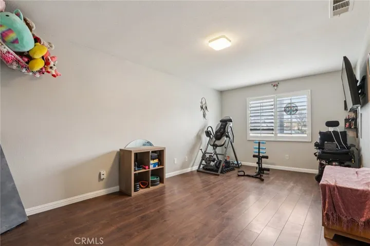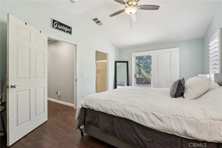 Welcome to this beautifully maintained home in a desirable location. A charming front patio creates a warm and inviting entry, setting the tone for the thoughtful design found throughout the home. Inside, you’ll find a generously sized downstairs bedroom and a full bathroom with a walk-in shower—ideal for guests, multigenerational living, or a private home office. The kitchen features stainless steel appliances, a full backsplash, pantry, and a center island with seating, perfect for casual dining or entertaining. Wide-plank laminate flooring enhances the staircase and bedrooms, while durable tile flooring runs throughout the downstairs living areas and wet spaces. Upstairs, the convenient laundry room includes upper cabinetry, a hanging rod, and shelving for added organization. The spacious primary suite offers a private deck overlooking the backyard, creating a peaceful retreat to enjoy morning coffee or evening relaxation. Outside, the expansive backyard features a large concrete patio, lush green grass, and mature trees—ideal for gatherings or quiet outdoor living. Additional upgrades include owned solar panels, a whole-house water softener system, water filtration in kitchen, Nest thermostat, Ring doorbell, and plantation shutters throughout. Conveniently located within walking distance of Fallen Heroes Park, just around the corner from Oak Valley Golf Club, and offering easy access to Interstate 10, this home combines modern amenities with a prime location.