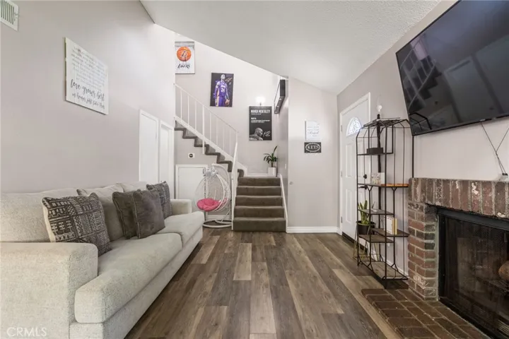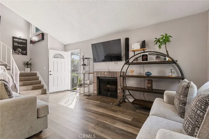 Step inside to a bright and airy living room with soaring vaulted ceilings, stylish wood-style flooring, and a cozy brick fireplace that creates a warm and inviting atmosphere. The open living and dining areas flow seamlessly into the kitchen, offering generous cabinetry and ample counter space, perfect for both casual meals and gatherings with family and friends.