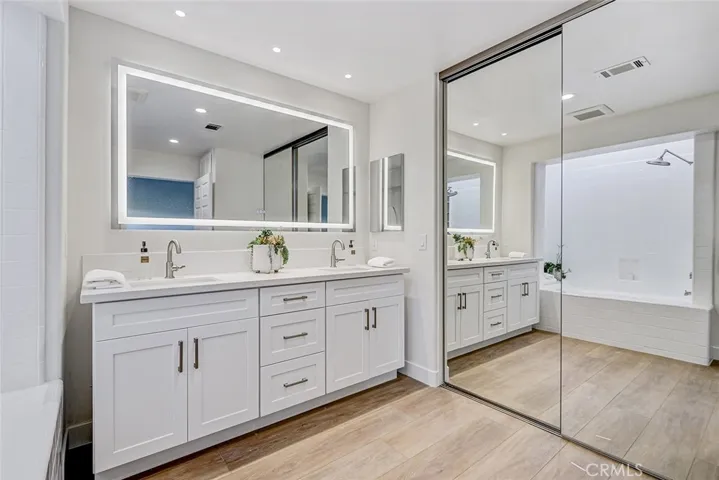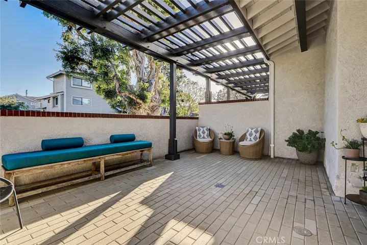 Beautiful and filled with light, this desirable updated PLAN 1 townhome features 2 bedrooms, 2 bathrooms, 2 living spaces, a built-in desk area, an oversized outdoor patio, a balcony off the primary suite, and a private (with direct access) 2-car garage. The nicely sized living room, with tall ceilings, features a fireplace with a new custom stone surround and a new slider that offers direct access to the patio. The updated south-facing patio flows from the living room and is easily accessible from the sliding door. There is a nice-sized area that flows off the kitchen that is ideal for an eating table and a small seating area. The updated kitchen offers newer quartz countertops and appliances. There is good counter space and storage (to include a pantry) and a nice-sized breakfast bar area. The kitchen window is placed in an ideal location (over the sink) to allow the beach breeze to flow through the home toward the south-facing clearstory windows, as well as the living room window and slider. There is a bedroom and a full bath on this level, offering flexibility to suit anyone’s desires. The upstairs primary suite is spacious, offers high ceilings, a private balcony, an updated oversized full bathroom with double sinks, and a nice-sized walk-in closet. Both bathrooms offer nice lighting with backlit antifog mirrors. All bathrooms have new vanities and plumbing fixtures. Luxury vinyl flooring is installed throughout the home, making it easy to clean and maintain. The garage is ready for cars and storage. Additionally, the home has been newly painted. The Manhattan Village is the only gated community in Manhattan Beach and is Secure, Connected, and Exceptionally Convenient. This micro community is conveniently located next to the best the city has to offer, with its private, walkable access to some of the newest and most desirable shopping, entertainment, and more. Within the community, there are well-lit sidewalks, a pool and spas (one of the numerous spas is just a few doors down!), as well as direct access to the Manhattan Village Mall, the Manhattan Country Club, and the city’s only golf course. HOA dues: $830/month. Photos with furnishing have been virtually staged.