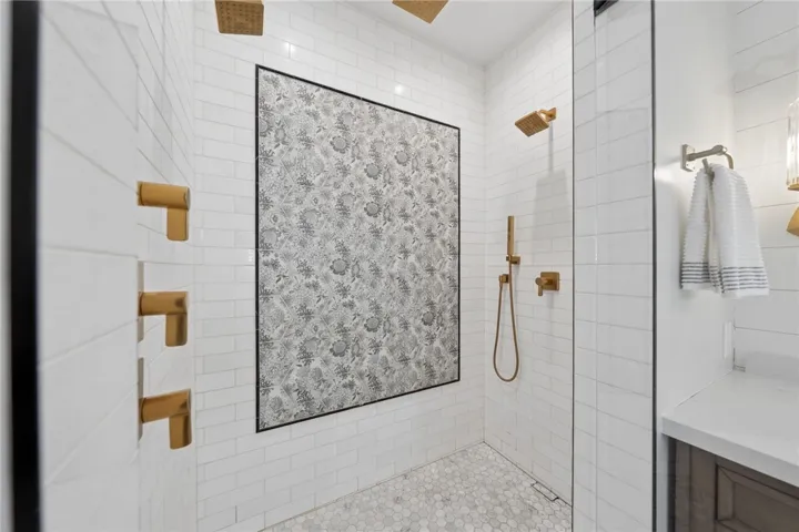 The custom wood stairs with quartz risers lead to a luxurious primary suite with a custom built-in drawer system and a spa-inspired bathroom featuring marble floors, a freestanding soaking tub, and a custom marble shower with dual heads, wand, and rain feature. 3 additional bedrooms are located on the second level. One is equipped with a full bathroom in the room perfect for guests.