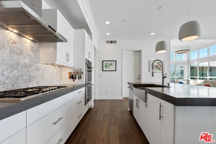 Stunning single-level Skylar penthouse featuring soaring ceilings and an expansive open floor plan. Step inside to an abundance of natural light, highlighted by gorgeous wide plank hardwood flooring throughout. The chef’s kitchen is beautifully appointed with top-of-the-line stainless steel Thermador appliances, an oversized center island with striking pendant lighting, marble backsplash, and a walk-in pantry. The kitchen flows effortlessly into the dining area, where accordion doors open to an oversized patio, creating a seamless indoor-outdoor living experience. Just beyond the dining space is a spacious living room with dramatic high ceilings and large windows that flood the home with light. Retreat to the luxurious primary suite featuring two walk-in closets and a contemporary bathroom complete with an elegant glass barn door, soaking tub, glass enclosed shower, and dual sink vanity. On the opposite side of the home are two generously proportioned bedrooms, one featuring a custom Murphy bed, connected by a modern Jack and Jill bathroom. Additional amenities include a fully renovated powder room, a custom built-in bar with a wine fridge, a generous laundry room with a new washer and dryer, a private two car garage with built-in storage and an EV charger, solar panels, and exceptional privacy as the only residence on the top floor. Enjoy the best of Playa Vista living at Osprey Ln, just moments from shops, dining, parks, and everything this vibrant community has to offer.