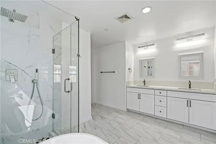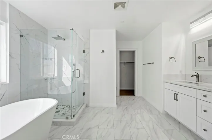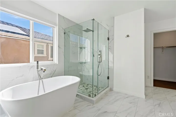Upstairs you will find generously sized bedrooms and a spacious primary suite featuring a luxurious bathroom with a soaking tub, separate glass-enclosed shower, dual vanities, and a large walk-in closet.
