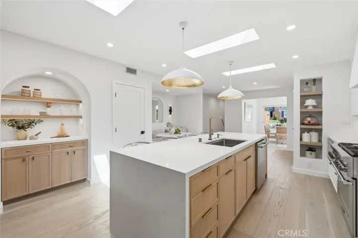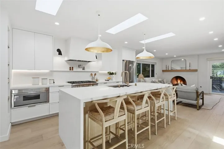 Extensively renovated with high-quality finishes throughout, the home features beautiful white oak floors, an open floor plan, and spaces designed for comfortable everyday living and relaxed entertaining. The kitchen flows seamlessly into the main living area and features Thermador appliances, generous counter space, and a custom built-in dining nook that creates a welcoming place to gather. Three skylights bring in abundant natural light, highlighting the thoughtful design and quality finishes. The living room features a fireplace that adds character and comfort to the space.