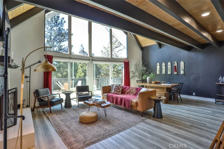As spring arrives in the mountains, Crestline comes alive with fresh pine-scented air, bright sunshine, and endless opportunities to enjoy the outdoors. Tucked among the towering trees just under a mile from Lake Gregory, this classic A-frame retreat offers the perfect place to experience the season, whether you’re starting the morning with coffee on the deck or heading out for a hike along nearby trails like Crestline Canyon, Heart Rock, or Strawberry Peak. Inside, the dramatic living space welcomes you with soaring vaulted ceilings, exposed beams, and expansive windows that fill the room with natural light and frame peaceful mountain views. The open design creates an inviting setting to gather, relax, and enjoy the slower rhythm of mountain life. Imagine afternoons spent with sunlight pouring through the windows, evenings around the fireplace, and weekends hosting friends after a day on the lake. Step outside to the wraparound deck and take in the surrounding forest and mountain scenery. Spring and summer in Crestline invite you outdoors, grilling with friends, reading in the fresh air, or simply enjoying the quiet beauty of the San Bernardino National Forest. With Lake Gregory just minutes away, you can spend your days fishing, boating, kayaking, or strolling along the scenic lake path before returning home to unwind beneath the tall pines. Thoughtfully remodeled and move-in ready, the home blends classic cabin character with modern comfort. Its versatile layout offers multiple spaces to gather or retreat, making it equally suited for full-time living, weekend escapes, or hosting guests. Already registered for short-term rental use, it also offers the potential to serve as a turnkey vacation home or income-producing mountain getaway. Designer furnishings are available separately for buyers who want to begin enjoying the home right away. Whether you’re looking for a peaceful personal retreat, a place to gather with friends and family, or a mountain escape that can also generate income, this Crestline A-frame captures the spirit of life in the mountains, relaxed, refreshing, and surrounded by nature. Welcome to your mountain escape.