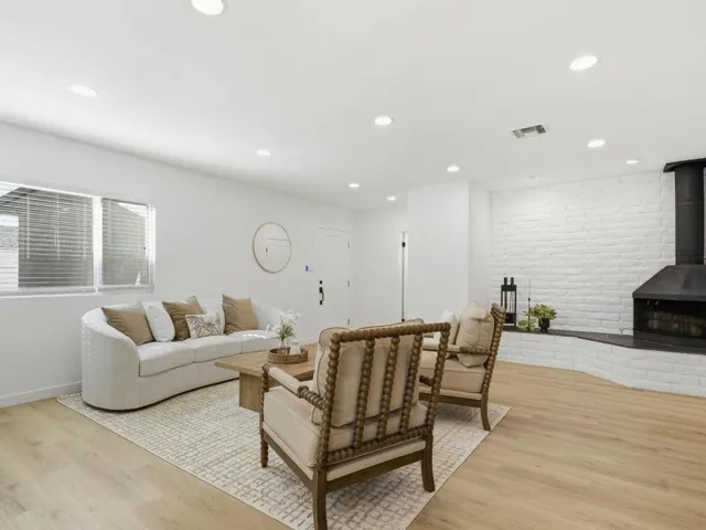Fresh finishes, expansive living spaces, and a thoughtfully maintained interior make this 3-bedroom, 2-bath home particularly impressive. Recessed lighting and wide windows illuminate the living area, while warm-toned flooring extends throughout to create visual continuity. A striking white brick fireplace feature anchors the room and provides a distinctive focal point. Nearby, a separate family room adds another comfortable setting for relaxing evenings, entertaining guests, or enjoying downtime. In the kitchen, abundant white cabinetry, sleek counters, a subway tile backsplash, and black appliances create a crisp, contemporary look. A window above the sink draws in natural light, and the efficient layout keeps cooking and preparation organized. Just beyond, the dining area sits beside large windows and sliding glass doors that open to the yard, allowing indoor meals to flow easily into outdoor moments. One pet dog is welcome to stay in this gorgeous home. Nearby grocery options include Target and other markets along Topanga Canyon Boulevard, while the expansive Westfield Topanga shopping center offers hundreds of stores, dining venues, and entertainment just minutes away. Fallbrook Center also provides additional retail, restaurants, and fitness options within easy reach.