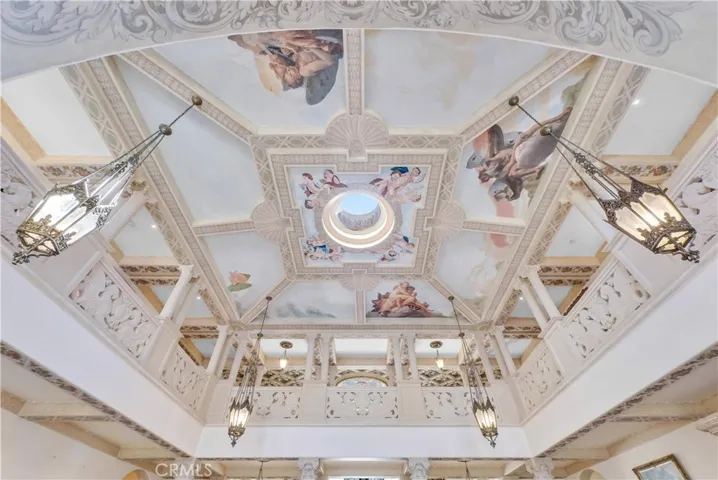 Hand-carved and coffered decorative ceilings; Elegant European-style fireplaces; A richly appointed wood-paneled study; A dramatic double-height grand hall; Expansive windows capturing sweeping Pacific views.