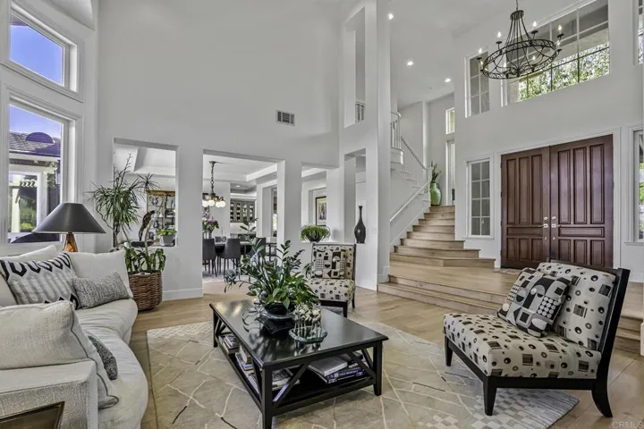 The Basics: 5 Bedrooms | 4 Full Baths | 2 Half Baths | 4,743 Sq Ft Resort-style Pebble Tec Pool & Spa with Waterfall | Pool House | Pickleball Sports Court | Panoramic Views | Low HOA. The Vibe: Light, bright, and soaring ceilings welcome you into a home that feels as good as it looks. This home is warm, welcoming, relaxed, and designed for connection — whether you’re entertaining or just unwinding. The chef-style kitchen is recently updated and ready for anything, whether you’re throwing dinner parties or heating up takeout. Peaceful nature views pour in from almost every room, setting the tone for everyday tranquility. Upstairs, a generous bonus living room makes the perfect teen hangout, media space, or private quarters for guests or a live-in companion. The existing Pool Table can be yours. Three on-suit bedrooms complete the upstairs. The Comforts: Lives like it’s a single level — the primary suite and a secondary bedroom are both downstairs. Primary suite is large, comfortable and comes with its own fireplace to enjoy on those cold winter nights. Owned solar keeps your energy bills low, with dual-zone A/C and heating to stay comfy year-round. Waterboy whole-house filtration system, central vacuum system. Additional comfort features include a wine fridge and warming drawer. The Grounds: You’ve got 2 private acres to roam — and it’s all yours. Serve it up on the Pickleball(ish) Sports Court (complete with basketball hoop), then cool off in the vanishing-edge pool or soak in the spa. Rinse off in your very own pool house, then head to the garden house or plan out that future ADU — there’s room for it. Want multiple fruit trees and herbs? Well you’ll have to plant those, but there are roses and a pomegranate tree. Plenty of room to get inspired with your gardening. Horse-friendly and full of possibility. Your Surroundings: Set within a peaceful gated community of manicured homes, you’re surrounded by open space, trails for hiking, biking and/or riding. A strong and welcoming Olivenhain vibe. Award-winning Encinitas school district and just a few miles to a plethora of shops, restaurants and other things to buy.