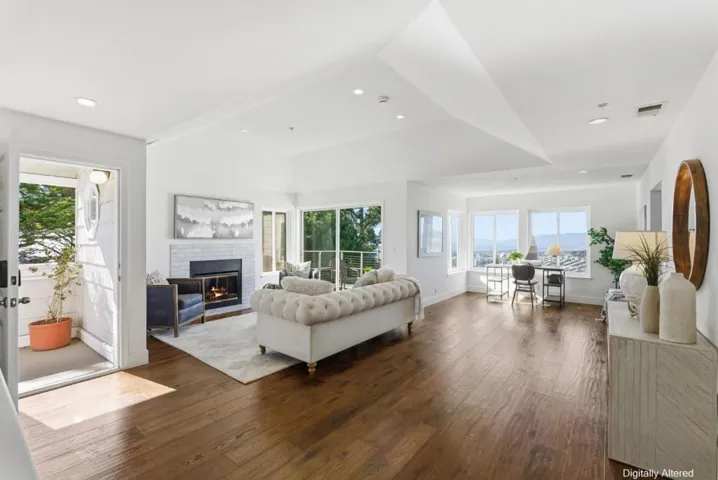 Beautifully updated condo offering spacious interiors, and sweeping city and coastal views. The main living area features hardwood flooring, recessed lighting, high ceilings, and a cozy gas fireplace that anchors the bright living room. The deck off the living room captures impressive views toward Lake Merced, Ocean Beach, Twin Peaks, and the downtown SF skyline. The updated kitchen combines style and functionality with quartz countertops, SS appliances, and modern cabinetry. High ceilings in both the living room and bedrooms enhance the open, airy feel of the home. The primary suite also features a private deck and spacious bathroom, fully tiled, double sinks and a modern stall shower. Residents enjoy access to a variety of community amenities including a clubhouse with event space, kitchen, and lounge area available for private gatherings, fitness center and dry sauna, beautifully landscaped grounds with scenic sitting areas and gated entry for added privacy. The community also offers expansive greenbelt areas and direct proximity to the trails of San Bruno Mountain State Park. With thoughtful upgrades throughout, multiple outdoor deck spaces, and access to amenities, this home offers a rare blend of comfort, convenience, and stunning Bay Area views.