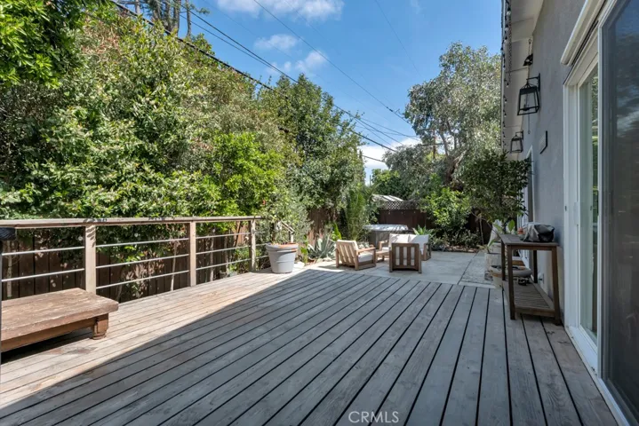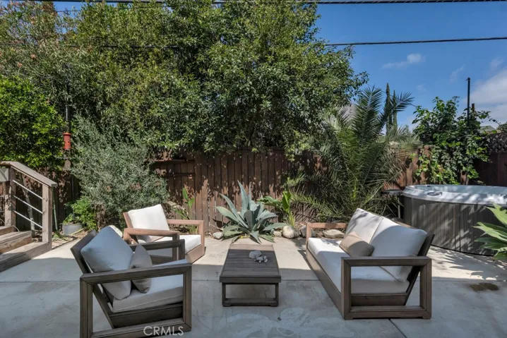 The private backyard creates a peaceful, zen-like escape with a fully functioning jacuzzi and lush landscaping. Mature olive trees, ficus trees, lemon trees, and striking blue agave plants create a serene outdoor environment. A gated dog run adds convenience for pet owners.