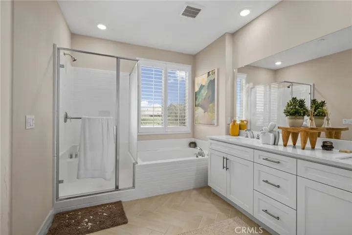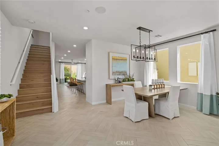 The formal dining room provides an inviting space for gatherings. The home boasts stylish herringbone tile flooring that leads you through the heart of the home—a spacious kitchen equipped with white cabinets, a beautiful gray subway tile backsplash, a built-in cooktop, and a microwave, perfect for culinary enthusiasts. The adjacent family room is airy and filled with natural light, creating the ideal space for relaxation and entertainment.