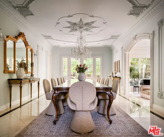 French Neoclassic Striking Prime Hancock Park Custom Home built from-the-ground-up in 2001 with 5 bedrooms + 5.5 baths, an amazing center hall plan with expansive rooms, high ceilings, intricate millwork, and lush grounds. Grand statement entry with 20 ft high ceilings, 10 ft high double front doors, dramatic double curved staircase with motorized sparkling crystal chandelier looks through dining room straight out to lush tropical backyard with palm trees, waterfalls, resort pool. Oversized formal dining room with architectural ornate molding opens with double doors to outdoor patio with pool, sun drenched formal living room with gas fireplace on one side, and kitchen/breakfast room on the other. Kitchen with center island, double sinks, double ovens, warming drawer, Sub Zero fridge/freezer has a breakfast room with beautiful windows to backyard with pool. The spacious elegant breakfast room overlooks the pool with radiused windows, and opens with doors to a newly tiled Jerusalem stone outdoor deck with built-in bbq. The yard with pool, built in 2004 and remote controlled, is an oasis with waterfalls, lush landscaping, spa, lounge deck. The living room has a grand piano and a roaring gas fireplace. The great big family room has built-in bookcases and TV, and a full wet bar. Powder room and laundry room down. One bedroom suite downstairs currently staged as an office. Upstairs, the grand oversized primary bedroom has new white oak floors, statement fireplace, large deck overlooking the pools and waterfalls, 5 closets, and a large en-suite bath with toilet closet +walk-in shower + sunken spa tub + skylight + double vanity with sinks. Three secondary bedroom suites upstairs with generous closets and full baths. Thoughtful storage space includes double deep storage closets under each staircase, coat closet, and an upstairs hallway closet for storage. 10 ft hi ceilings downstairs and 9 ft upstairs, Pella double paned windows, three zones HVAC – 1 downstairs, 1 primary bedroom, 1 rest of the upstairs, smart alarm system, new industrial hot water heater, 8 foot high solid interior doors throughout. Built by an esteemed Hancock Park family for themselves and true pride of ownership!