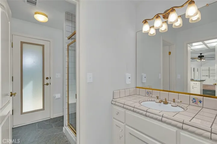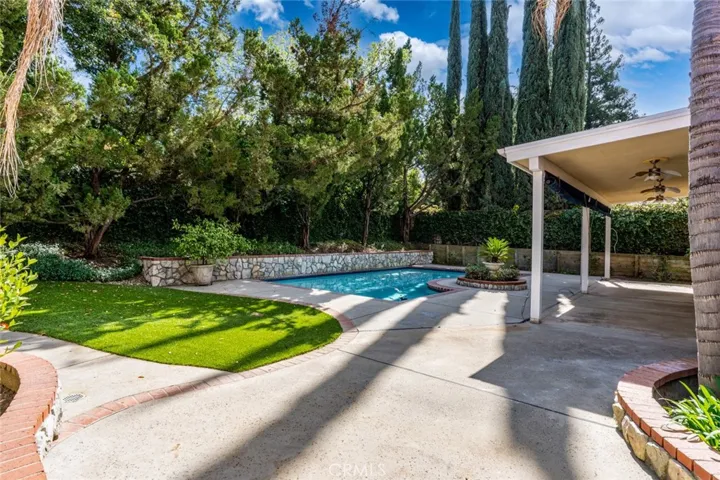 This beautifully maintained single-story residence offers timeless design, generous living spaces, and an exceptional location. The elegant entry introduces the home’s refined layout with formal living and dining room, ideal for entertaining or quiet gatherings. The spacious great room features vaulted ceilings and a gas fireplace, creating a warm and inviting central living space filled with natural light. The expansive kitchen and dining area provide both function and style with granite countertops, custom cabinetry, built-in refrigerator, and a gas cooktop, making it a perfect setting for everyday living and entertaining. A private bedroom and bathroom suite located just off the kitchen offers excellent flexibility for guests, extended family, or a home office. This bathroom also includes direct access to the backyard and pool area, creating convenient indoor-outdoor living. The primary suite serves as a peaceful retreat, featuring French doors that open to the backyard, dual closets, dual vanities, and a separate soaking tub and shower. Two additional bedrooms provide versatility for guest accommodations, office space, fitness, or hobbies. Additional amenities include a spacious laundry and mud room with sink, storage cabinetry, and washer/dryer, conveniently located off the three-car garage with built-in cabinetry, refrigerator, and garage door openers. The backyard is designed for relaxation and entertaining with mature landscaping, a large covered patio with ceiling fans, and a recently resurfaced pool, creating a private outdoor setting ideal for year-round enjoyment. Recent improvements include pool resurfacing, a new water heater, two-year roof certification, and Section One pest clearance. This exceptional home offers a rare opportunity to enjoy space, privacy, and location while allowing the next owner to personalize the interior to their own design vision in one of North Fresno’s most desirable communities.