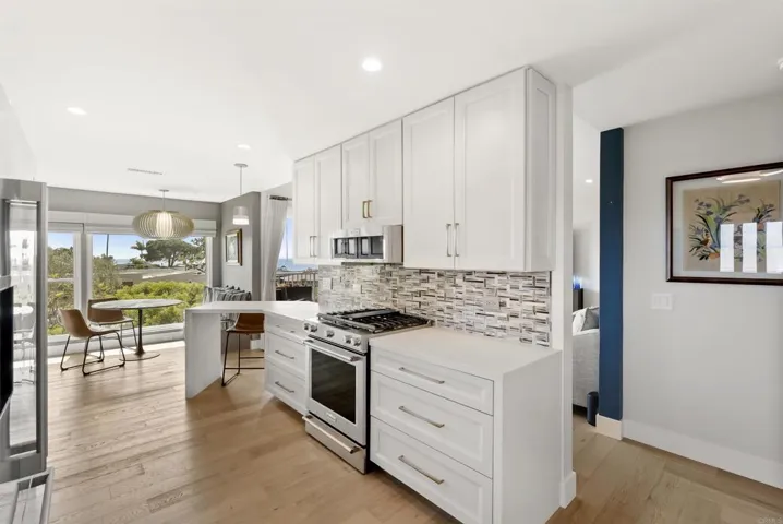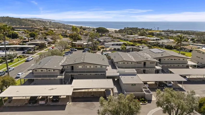 STUNNING LOCATION! Rare top-level end unit, this single-story luxury penthouse in Park Del Mar offers breathtaking panoramic ocean views. Completely remodeled from top to bottom with premium finishes, the home features custom folding glass doors that open seamlessly to your private patio, perfect for enjoying uninterrupted ocean breezes and spectacular sunsets. The open-concept floor plan showcases vaulted ceilings, beautiful wood flooring throughout, and abundant natural light. The residence offers 2 bedrooms and 2 full baths, thoughtfully designed with exquisite, spa-inspired finishes. The gourmet kitchen is equipped with top-of-the-line KitchenAid appliances and a Bosch refrigerator, ideal for both everyday living and entertaining. A full-size washer and dryer are conveniently located within the unit. Additional highlights include a nearby covered carport plus an additional open parking space for a second vehicle, as well as a private storage unit. The home also overlooks a tranquil greenbelt with a park-like setting. Residents enjoy resort-style amenities including a pool, sauna, and spectacular ocean-view clubhouse featuring a kitchen, showers, changing areas, ping pong, shuffleboard, and more. Ideally located just minutes from the beautiful beaches of Solana Beach, Del Mar, and Encinitas, as well as outstanding restaurants, shopping, and the world-famous Del Mar Racetrack.
