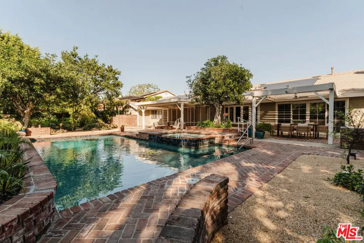 Imagine life in this stunning estate set on a rare double cul-de-sac! A gated courtyard guides guests toward the dramatic glass-inlaid entry of this sprawling one-story home, where rich woodwork frames the foyer and refined dining alcove. The adjacent pub-style bar glows beneath stained glass, an inviting spot for conversation or preparing your favorite cocktail. The sunken living room’s elegant fireplace is illuminated by a pair of skylights and flanked by French doors that open into a screened in sunroom filled with natural light. Hardwood flooring, recessed lights, and crown molding enrich the expansive family room, where a striking fireplace and glass doors create a seamless connection to the outdoors. Your kitchen blends style and function with handsome cabinetry, ample counter space, and a multi-seat island. Retreat to the impressive primary suite and rejuvenate within its sauna, dual dressing areas, and ensuite soaking tub. Outside, your entertainer’s backyard feels like a resort with drought-tolerant California native plants and citrus trees, and the perfect spot to start your vegetable garden. The yard also features a built-in grill, a sparkling pool and spa, and a pickleball/basketball court! A detached shed becomes an ideal remote office and a fabulous attached 3-car garage, too! Paid-off solar panels add everyday practicality, and other notables include the 2-year-old roof. You’re only moments from CSUN, CA-118, I-405, Northridge Fashion Center, and a wide selection of fabulous restaurants. Come experience a residence where entertaining and comfort come together effortlessly!
