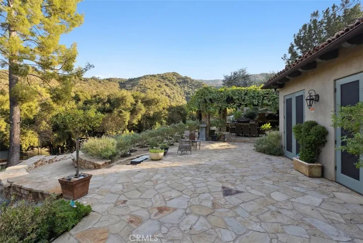 Welcome to “Hacienda de Roble”, A Timeless Custom Estate on 2 Acres of serene beauty. Nestled in the heart of nature, Set on 2 acres surrounded by majestic oak trees and rolling mountains, this one-of-a-kind property is a true sanctuary. A gated entrance and long circular driveway provide both security and ample parking space. Exquisite outdoor living by stepping outside to discover a variety of outdoor spaces. The flat, grassy yard is fully fenced, while stone patios, a vine-covered pergola, and a BBQ area set amidst lush botanical gardens creating the perfect backdrop for al fresco dining. Unwind in the outdoor hot tub, sip drinks at the wet bar by the creek, or gather around the fire pit for amazing sunsets. For the animal lovers, the property also includes small barns for goats, ducks, or chickens that enjoy a small flowing water feature. Designed by renowned architect Doug Burdge, the home’s architecture is dramatic and inspiring. The great room features cathedral wood-beamed ceilings, a striking herringbone brick fireplace, and walls of glass that offer expansive views of the property. The gourmet kitchen is a chef’s dream, boasting a massive natural stone island, Subzero refrigerator, Heston range, and Miele dishwashers. The adjacent bar area with a wine fridge and copper countertop is perfect for entertaining and butlers pantry with an additional refrigerator. A spacious family room flows seamlessly to one of the many outdoor patios, while an ensuite guest bedroom and multipurpose laundry room complete the main level. Luxurious primary suite ascend the custom tile and wood stairs to the private suite where vaulted wood-beamed ceilings, fireplace, leather tiled floors and a private balcony overlook the serene grounds. The spa like primary bath features designer wall coverings, a freestanding tub, separate shower and designer closet. Additional features include a cozy loft ideal for a library or play area, a Belvedere room with built in desks great for an office that looks out over the stunning estate. Recent updates include a newer roof, newer modern windows, and an updated HVAC system. For added peace of mind, the property is equipped with a Wi-Fi-enabled backup whole home generator. “Hacienda de Roble” is where nature and luxury converge, providing a serene and elegant living experience. This estate offers the perfect blend of privacy and elegance. Don’t miss the opportunity to own this exceptional home.