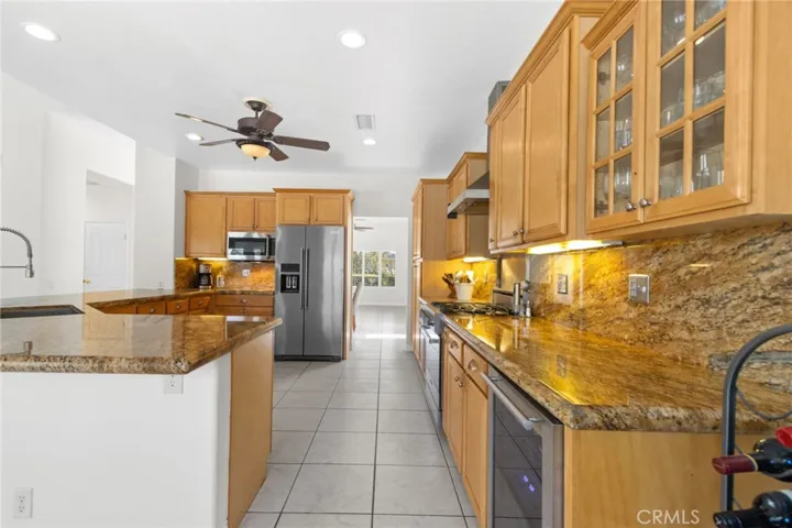 The gourmet kitchen features custom maple cabinetry, granite countertops, and upgraded appliances, opening seamlessly to the main living spaces. Additional highlights include plantation shutters, multiple ceiling fans, a private courtyard entry, and a three-car garage.