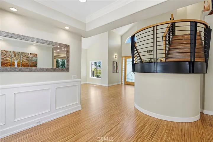 A striking structural steel staircase with hardwood steps leads upstairs to the primary suite with a private retreat, ideal for a home office, workout space, nursery, or reading lounge. The remodeled bathrooms offer a tranquil, spa-like retreat with custom tile, stone counter tops, and thoughtful finishes, while the closets features custom built-ins for style and organization.