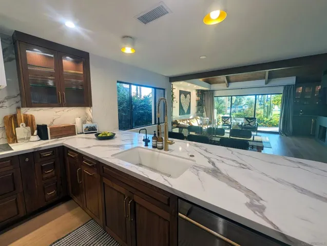 Completely reimagined designer residence in Mission Hills, ideally positioned directly across from the tennis and sports center with effortless access to pickleball and sweeping 180° mountain views. This rarely available, premium location pairs perfectly with a no-expense-spared renovation where every surface has been thoughtfully upgraded. The home features wide-plank wood flooring, vaulted ceilings with refreshed beams, and a bright, open layout enhanced by all-new high-efficiency windows and a dramatic multi-slider. The chef’s kitchen is a showpiece with custom walnut cabinetry, quartz countertops, and a full suite of Café appliances including induction cooktop and combo oven. A stylish wet bar with beverage fridge adds to the entertaining appeal. Both bathrooms have been fully transformed with Kohler fixtures, including a spa-like primary retreat with soaking tub and smart bidet, and a guest suite with steam shower. Additional upgrades include custom closets, solid wood doors, new HVAC, tankless water heater with instant hot water circulation, water filtration and softener, new electrical throughout, and LED lighting. Outdoor living is enhanced by a new pergola, creating the perfect setting to enjoy the mountain views and desert lifestyle. This is a rare opportunity to own one of the most extensively upgraded and best-located homes in Mission Hills.