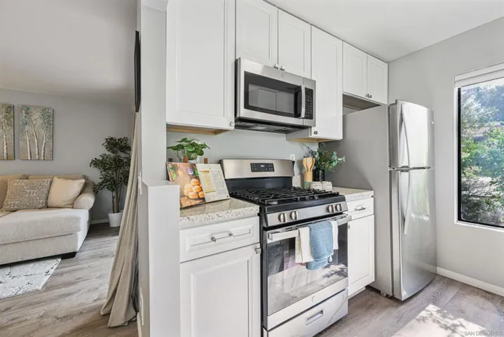 Beautifully Updated First-Floor Condo in Prime Walkable Location! Welcome to this thoughtfully updated 1st-floor condo offering comfort, style, and unbeatable convenience. This move-in ready home features Luxury Vinyl Plank flooring, newer interior paint, new lighting, mirrored closet doors, and a bright, modern feel throughout. The renovated kitchen and bathroom showcase cabinetry, quartz countertops, a gas range, dishwasher. Enjoy the convenience of stackable laundry located in your spacious private patio, with an additional community laundry room nearby if desired. Your covered parking space and the community pool are just steps from the unit entrance ,making everyday living effortless. Location is everything, and this condo truly delivers that! Step outside and enjoy a vibrant, walkable neighborhood where nearly everything you need is within 5–10 minutes: Morning coffee at Better Buzz or Starbucks Breakfast at IHOP Groceries at Vons or Target Pharmacy access at Walgreens or CVS EV charging nearby with Tesla and Electrify America stations Dining options galore: Habit Burger, Chick-fil-A, Chipotle, Little Sakana (all-you-can-eat sushi), Pista House (authentic Indian cuisine), or District 6 Gastropub Mira Mesa Library and neighborhood parks just a short stroll away Whether you’re a first-time buyer, downsizer, or investor, this home offers the perfect combination of modern updates and unbeatable convenience in a highly desirable location. Everything you need is just steps from your front door.