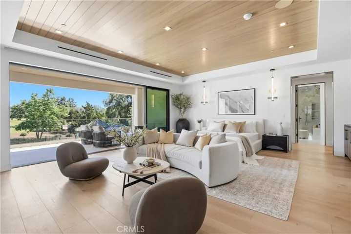 This gorgeous, brand new view estate with a premier location in the heart of North Ranch, is sited at the end of the cul de sac on a privately gated street. Spanning over 9,000 square feet of luxury living (with guest house) and boasting sensational views of the fairway of North Ranch Country Club, the home features a superb, open floor plan that’s flooded with natural light and enhanced by top quality finishes throughout. There are six large ensuite bedrooms, including the stellar primary suite with retreat, two sided fireplace, all stone bath with steam shower, room sized custom closet and a big walk-out view balcony. Additional amenities include a beautiful, center island chef’s kitchen complete with counter seating, wide open to the big great room with nearly 30′ of sliding walls of glass, bringing the outdoors in, plus an adjoining lounge area with back-lit Onyx wet bar & glass encased wine cellar, a media room, and casual living & dining rooms that are perfect for easy entertaining. The spacious grounds include a sparkling pool & spa, your own pickleball court, a large sunken firepit, a big covered patio with space heaters & music, and a charming guest house with an additional bedroom, bathroom & family room. Conveniently located within easy walking distance to North Ranch community park, along with nearby shopping & restaurants, and close to the beaches of Malibu, this true custom estate has much to offer.
