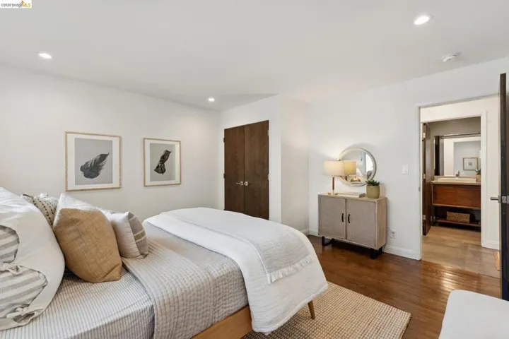 Masterfully reimagined modern gem with sparkling bay views and crystal-blue pool. Spanning 2236 square feet, the home’s level floor plan emphasizes effortless flow and clean architectural lines. The heart of the home is the custom kitchen with premium finishes. The open-concept floor plan connects kitchen with family room, where a tiled fireplace offers a tactile focal point. From here, move outdoors to an impressive private oasis. A broad Batu hardwood deck hosts lounge seating and firepit, and generous dining space. Three steps down, the boldly hardscaped patio features a zen-like swimming pool with integrated spa. Float and gaze at the bay views beyond, or enjoy an outdoor shower. The spacious interior hosts a primary retreat with many fine accents, also offering access the backyard for a midnight dip. Stunning, calming, inviting. Soak in wellness in this Sequoyah Hills sanctuary. OPEN SUNDAY, MARCH 22, from 2:00-4:30PM.