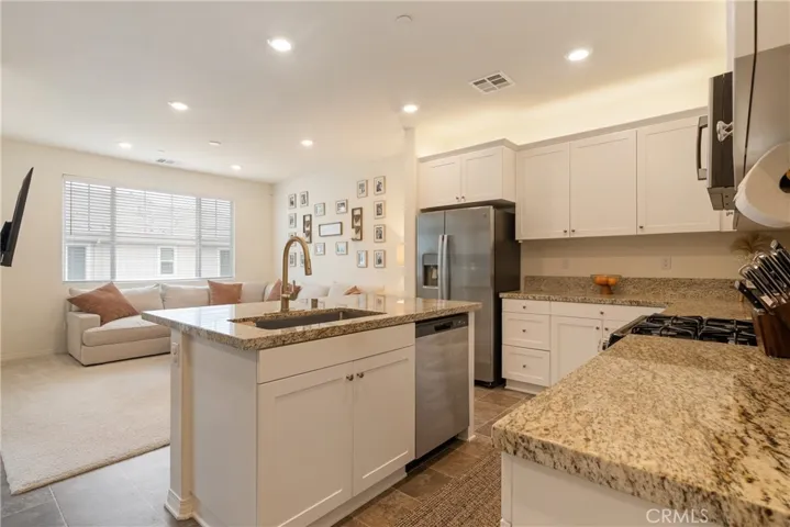 Upstairs, the main living area offers a bright open-concept layout. The kitchen features white cabinetry, granite countertops, and stainless steel appliances, and opens directly to the living and dining areas. From both the living room and the private balcony, you can enjoy beautiful views of the San Gabriel Mountains, creating a great space for morning coffee or relaxing outdoors.