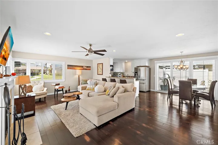 The bright and inviting living area features a cozy fireplace and warm wood flooring that flows seamlessly throughout the home, creating a welcoming and open atmosphere. The beautifully updated kitchen boasts crisp white cabinetry, granite countertops, and stainless steel appliances. A spacious dining area with sliding glass doors with plantation shutters opens to the large backyard, where a private patio creates a serene retreat, perfect for relaxing or entertaining family and friends. The generous primary suite offers mirrored closet doors and an en-suite bathroom complete with a dual-sink vanity and granite countertops. The secondary bedroom is also spacious and features mirrored closet doors, providing comfort and flexibility for guests or a home office. With only one attached wall, it feels like a stand alone home. The attached garage offers secure parking along with an additional assigned parking space conveniently located next to the home.