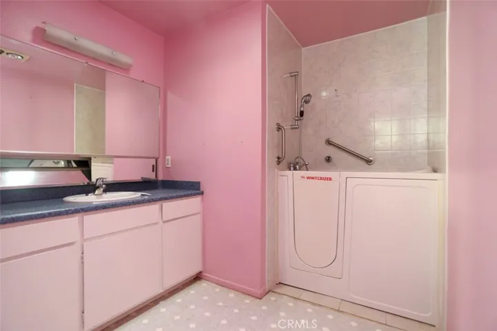 One bedroom includes a built-in bookshelf and does not have a closet. The spacious primary bedroom offers generous closet space, and the primary bathroom features a walk-in tub/shower combination.