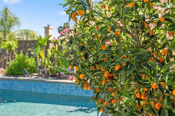 The resort-style backyard features a saltwater PebbleTec pool with Baja step, spa, waterfall features, and color-changing lights. Enjoy outdoor entertaining with a BBQ island featuring a built-in fire pit tabletop and mini fridge, along with mature fruit trees including kumquat, pomegranates, lemons, and grapes.