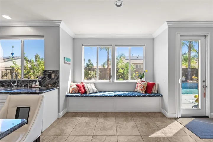 The home opens to an open-concept kitchen and family room designed for everyday living and entertaining. The upgraded kitchen features a large granite island, double ovens, butler’s pantry, walk-in pantry, soft-close drawers, under-cabinet lighting, and a built-in storage bench overlooking the pool. The family room offers a cozy fireplace and welcoming gathering space. The main floor also includes additional storage and a laundry room.