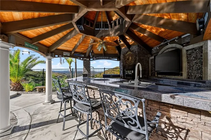 Welcome to what is arguably one of the most beautiful homes in all of Canyon Hills, perfectly positioned on what may be the best lot in the entire community. Inside, the home has been fully remodeled with a clean, elevated feel that still feels warm and livable. You’ll find luxury vinyl plank flooring throughout, a completely upgraded kitchen with custom marble countertops, a detailed stone inlay backsplash, a waterfall island, and black stainless steel Samsung appliances that tie it all together. The living space is anchored by a built-in entertainment center, creating a natural place to gather and unwind. As you enter, custom wood-wrapped pillars frame the transition into the living area and immediately set the tone for the level of detail throughout the home. The layout offers 4 bedrooms, a dedicated office, and a spacious loft, giving you flexibility for whatever stage of life you’re in. The primary suite has its own standout features, including a barn door accent and direct access to a private deck where you can take in incredible views of the mountains and Canyon Lake. Additional upgrades include solar and an epoxy-coated garage that’s as clean and polished as the rest of the home. And then there’s the backyard. Designed to feel like your own private escape, the space is filled with lush, exotic landscaping, including a producing banana tree, and a custom flagstone-wrapped pool with a sun step, built-in bar, and plenty of room to entertain. The views are unreal, stretching across the mountains and Canyon Lake, with the added bonus of front-row seats to Fourth of July fireworks right from your own home.