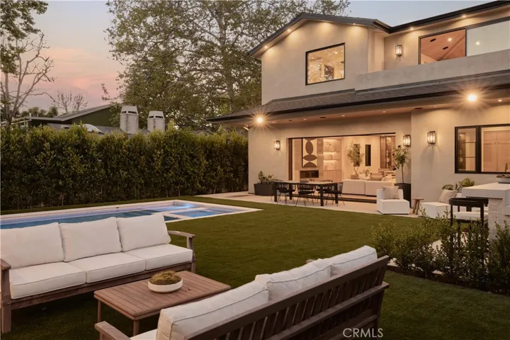Set behind private gates on an expansive 9,000+ sq. ft. lot, this newly constructed architectural estate features a detached two-bed, one-bath ADU. Designed for modern living, the open-concept main level flows effortlessly from the spacious living and dining area into the designer chef’s kitchen, equipped with top-of-the-line appliances, sleek custom cabinetry and a stunning waterfall island. An oversized sliding glass door disappears into the wall, seamlessly extending the living space to the entertainer’s backyard retreat, where an outdoor kitchen with bar seating invites al fresco dining, and a sparkling pool and spa create a private resort-like escape. Completing the main level is a state-of-the-art home theater, ensuite bedroom and chic powder bathroom. Upstairs, four generously proportioned ensuite bedrooms are complemented by a dedicated laundry room. The primary suite is a true retreat, boasting a private balcony, custom walk-in closet and spa-inspired bathroom with a soaking tub, rainfall shower, double vanity and smart toilet. Additional features include high ceilings throughout, a two-car garage and fully integrated Control4 smart home system that manages lighting, climate, audio and security. The detached ADU offers incredible flexibility, with its own living room, full kitchen, two bedrooms and a bathroom, perfect for guests, extended family or as additional living space. Situated on a quiet tree-lined street, this property is ideally located within the coveted Dixie Canyon School District and just moments away from Ventura Boulevard, Westfield Fashion Square, the Shops at Sportsman Lodge and all that the Valley has to offer.