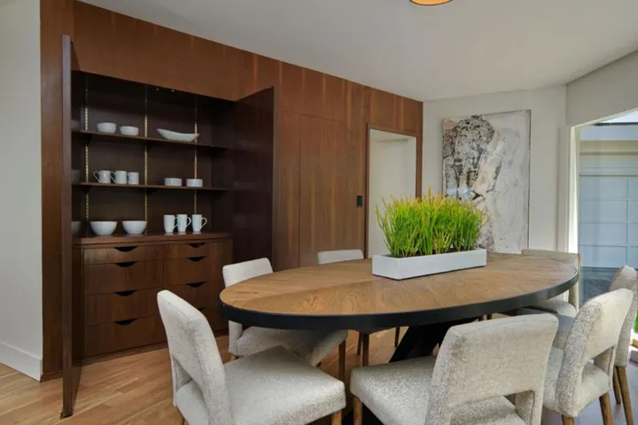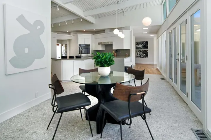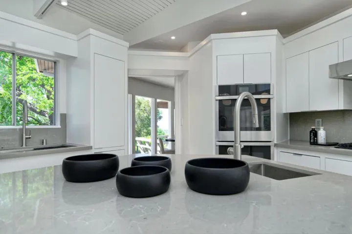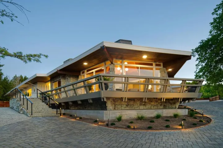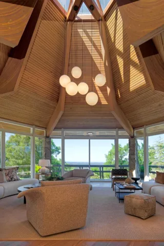 First time offered following a total transformation, this profound California Modernist statement occupies a rare knoll-top pinnacle. With 270-degree views impossible to replicate, the estate sits at a quiet terminus with no drive-by traffic. The structural soul is a hexagonal pavilion utilizing a “spoke-and-hub” plan. A soaring, timber-clad pyramidal ceiling with a hexagonal oculus transforms the Great Room into a sundial, while free-form lighting counterbalances the post-and-beam drama The kitchen is a high-performance pivot point for family and hosting. Large-format glass sliders create seamless connectivity to the pool deck. Outfitted with all-new professional appliances and waterfall quartz counters, the space is grounded in Italian porcelain tile. The single-story layout allows outdoor access from almost every room. Wraparound terraces capture vistas from the SF skyline to the Santa Cruz mountains. Due to the topography, the home and rear grounds remain entirely invisible to neighbors and the street. Unified by American Cherry flooring, the interior features floating vanities, a paneled library with a period bar, and a dining room with custom built-ins. The estate includes a detached yoga studio, solar-integrated roofline, and comprehensive landscape lighting.