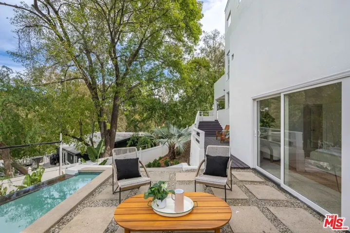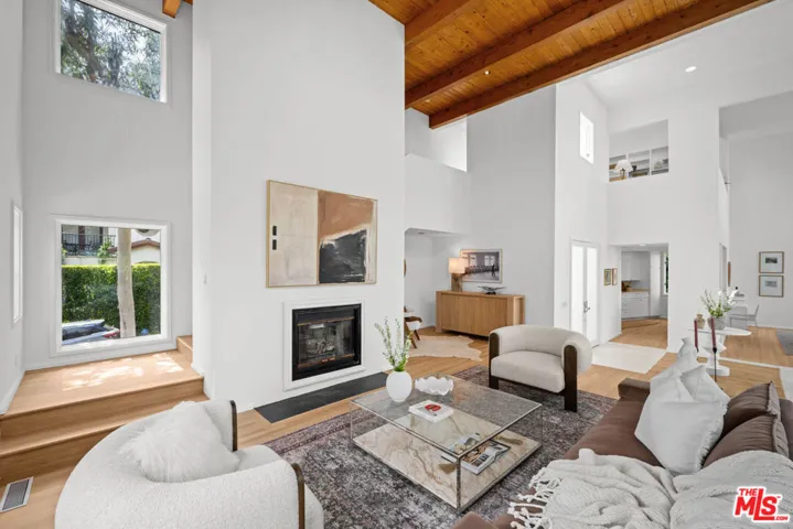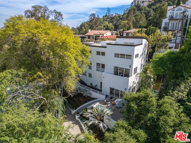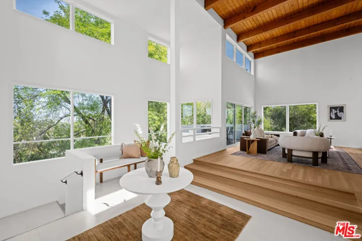Perfectly positioned in the Hollywood Hills, this residence offers an exceptional opportunity for those seeking both inspiration and convenience. Nestled among lush greenery, this architectural home, built in 1990, represents a classic transitional modern hillside design. Enter through double doors to a dramatic double-height entry, where abundant natural light and serene green views create an immediate sense of openness and calm. The expansive central hall seamlessly connects the living room with its private wood deck to the dining area and kitchen, creating a natural flow ideal for both everyday living and entertainment. The spacious kitchen features a Jenn-Air cooktop, stainless steel appliances, and a large pantry. Thoughtfully designed with an open-concept layout, an early expression of today’s modern living, this home emphasizes volume, light, and connection between spaces. The upper level offers a versatile room with an en-suite bathroom, ideal as a home office, guest room, or third bedroom. On the lower level, the primary suite includes a generous walk-in closet and a large bathroom with dual vanities. Sliding doors open to a private garden retreat featuring an expansive wood deck, jacuzzi with waterfall feature, and lush landscaping. The outdoor space is designed for relaxation and entertaining, complete with a fire pit lounge and a setup suitable for outdoor movie screenings. Enjoy the best of city living with close proximity to Hollywood, Studio City, and the iconic Sunset Strip, offering a vibrant mix of dining, entertainment, and cultural experiences. Convenient freeway access provides an easy commute throughout Los Angeles while maintaining the tranquility of hillside living.