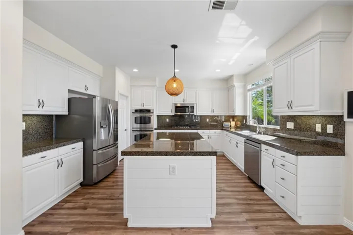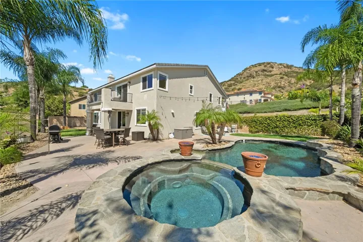 *PRIVATE POOL & SPA * STUNNING VIEWS * PRIVACY * LARGE LOT * GUARD-GATED COMMUNITY Set near the highest point in Greer Ranch on an expansive 11,761 sq ft lot, this exceptional 3,806 sq ft home showcases sweeping views of the Santa Rosa Plateau & Temecula Valley, with only one home above it. A long driveway, new landscaping, freshly painted exterior, updated wrought-iron glass front door & 3 car garage create a striking first impression. Inside, soaring 2 story ceilings, luxury vinyl plank floors & neutral interior paint set the stage, while the formal living & dining rooms are filled with natural light from expansive windows. The kitchen features granite counters, white cabinetry, stainless steel appliances & a walk-in pantry, opening to a beautifully updated farmhouse-style family room with shiplap accent wall, remodeled fireplace with wood mantle, custom built-in with floating shelves, recessed lighting, ceiling fan & dry bar with tile backsplash & beverage fridge. A wall-to-wall roll-up screen with hidden projector adds a fun touch for movie nights. The main floor offers a bedroom with ceiling fan & walk-in closet & includes an attached bath with walk-in shower, ideal for guests or multi-gen living, along with an additional upgraded 1/2 bath & laundry room with sink & abundant cabinetry off the 3 car garage with epoxy floors & hi-loft storage. Upstairs offers 3 secondary bedrooms (2 of them a Jack-n Jill), 2 baths & a large bonus room with wood floors, barnwood door entry & balcony. Privately situated away from the secondary bedrooms, the primary suite features double door entry, its own private balcony with stunning views, jetted tub, walk-in shower, make-up vanity & large walk-in closet. The backyard is a private haven with a saltwater pool & spa with fire bowls, grassy area, horseshoe pit & patio spaces to relax or entertain. Additional features include a Quiet Cool whole house fan, attic fan, NEST cameras & ADT pool security system. Located within the guard-gated Greer Ranch community with 24 hr security, scenic hiking & biking trails, parks, community pool & spa, and year-round neighborhood events. Enjoy convenient access to the 215 & 15 freeways, nearby shopping & dining, Old Town Temecula, Temecula wineries & the Promenade Mall, all w/in the highly regarded Murrieta school district. Don’t miss this rare opportunity to own a pool & view home that blends privacy, space & everyday luxury.