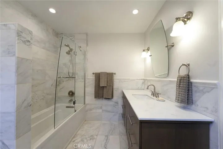This property is a classic original 1920’s character Mediterranean home featuring six bedrooms and five bathrooms, in addition to a fully converted and separate cottage suite suitable for versatile use (mother-in-law apartment or art studio). The home features a modern, earthy, skim coat exterior, an oversize original front door, and a foyer tiled in Walker Zanger marble. The living area boasts a high, arched ceiling, Murano fixtures, an original Batchelder gas fireplace, built-in shelving, and original 3/4 inch hardwood floors. The kitchen includes a central island with a full stove/oven, a separate wall-mounted dual oven, a breakfast nook with built-in storage, ample counter space, and abundant natural light, with all appliances included. The former front porch has been incorporated to create a library/den space with matching oak hardwood floors, custom shelving, and custom front-facing windows. The spacious dining area is highlighted by a custom 128 raindrop blown glass fixture, a large north-facing window, and three skylights. A dedicated family room completes the interior features, including a TV, a bar sink, and handmade wood cabinets.