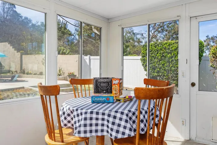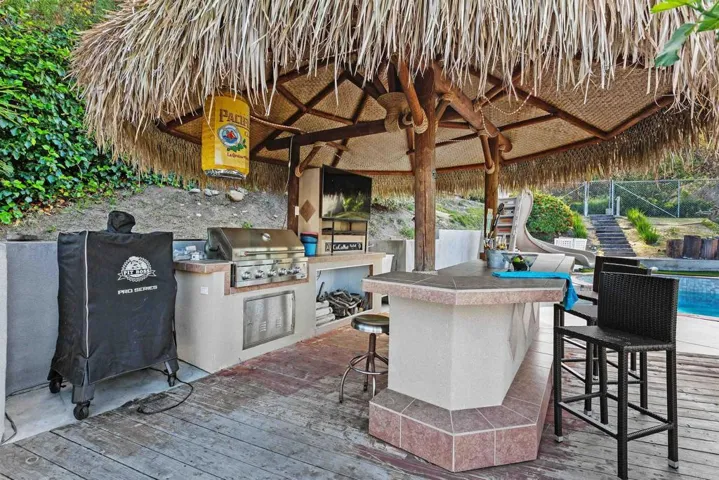Experience resort-style living in this spacious single-story, 4-bedroom, 3-bathroom home located in a highly sought-after Poway neighborhood. Situated on nearly a quarter-acre lot, this property offers an expansive feel with breathtaking mountain views and a backyard designed for ultimate entertainment. Enjoy peace of mind with significant recent updates. Within the last five years, the HVAC system, tankless water heater, and kitchen have all been tastefully replaced and upgraded. The home is designed for energy efficiency and year-round comfort, featuring: owned solar, dual-paned window throughout, a whole house fan and enclosed sunroom- perfect for a home office, gym, or playroom The backyard is a true private oasis, meticulously designed to be the “coolest” spot in the neighborhood:The outdoor kitchen features a beautifully constructed 15-foot palapa, custom bar, and built-in grill. The salt water pool includes a ‘Shamu’ baja shelf with an umbrella holder and a massive slide for endless summer fun, complemented by an above-ground spa. Harvest your own fruit from mature lemon, lime, grapefruit, and fig trees. The converted garage offers flexible space for a guest suite, hobby room, or additional living area with a full bathroom nearby Located within the boundaries of the award-winning Poway Unified School District, you are minutes away from premier shopping, dining, and easy freeway access. Whether you’re hosting a summer BBQ under the palapa or enjoying the quiet mountain vistas, this home offers an unparalleled lifestyle.