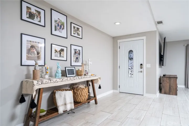 Step inside to a bright and spacious living area featuring upgraded tile flooring, recessed lighting, and large newer windows that bring in plenty of natural light. The open floor plan flows seamlessly from the living room into the dining area and remodeled kitchen, creating the perfect space for everyday living and entertaining. The kitchen features white cabinetry, stainless steel appliances, ample counter space, and a breakfast bar that opens to the dining area.