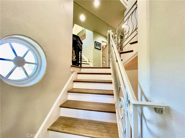 Upstairs, the primary suite offers a spacious walk-in closet and an oversized dual shower, along with added comfort from updated window coverings. Additional features include skylights with remote shades, a marble natural gas fireplace, central air conditioning and heating, tankless water heater, water softener system, central vacuum, and in-unit laundry with gas dryer.