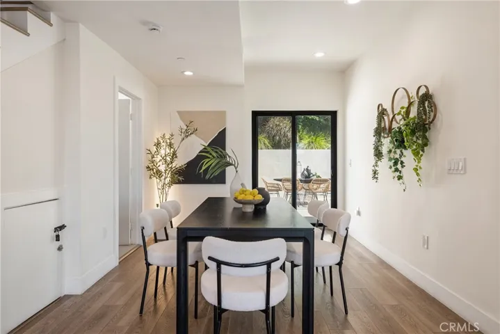 The kitchen is designed with European-style cabinetry, quartz countertops, and stainless steel appliances, offering both style and functionality. The layout flows naturally into the dining area and out to a private, breezy patio—ideal for everyday living or hosting.