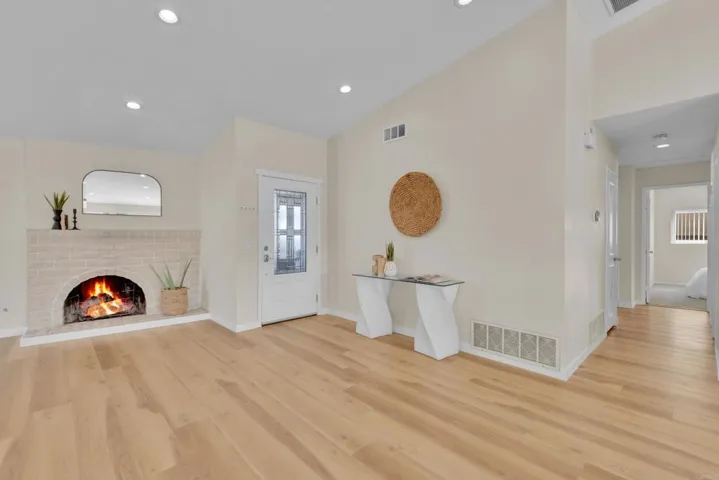 Welcome to 11033 Hillcreek Road, a beautifully sleek 5 bedroom home with a sparkling pool and amazing views. The home backs up to the walker trail preserve, so no one behind you but the peace and serenity of nature as you sit by the pool for a morning dip, or just take in the songs of the birds with your coffee. You will love the new kitchen with high end stainless steel appliances and built in espresso/coffee maker, warm fireplace, and modern organizational closet system with interior lighting throughout. Features include, a separate spa and many mature fruit trees, soothing front fountain water feature. Energy efficient with a fully paid solar system, whole house fans, Attic with an auto gable fan, whirly bird ventilation, R-30 insulation in attic, Low-E windows, tankless water heater, and low energy IntelliFlo pool pump. New A/C and separate mini split in 5th room. Roof and Solar are approximately 7 years old. 5th bedroom is a garage conversion and can easily be converted back to a garage if desired. Just steps away from the walking trails and Hillcreek Elementary School. Close to highways, and shopping. You will fall in love with this home, tucked away in one of Santee’s coveted hidden gem neighborhoods.