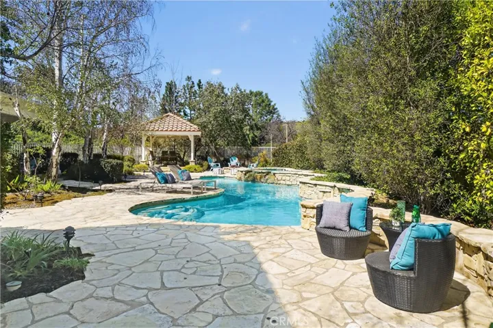 If I told you that you could live in a Calabasas home, in a guard gated community, with an amazing, spacious, entertainers backyard (pool, spa, outdoor kitchen, 2 gazebos – very rare for Calabasas Hills) and all the bedrooms have en-suite bathrooms – What would you say? Welcome to 24751 Calle Largo—where comfort, craftsmanship, and resort-style living come together in one of Calabasas’ most desirable gated communities. Thoughtfully renovated over the past 11 years, this exceptional home showcases quality upgrades and custom features throughout. The beautifully redesigned kitchen is the heart of the home, featuring custom cabinetry with pull-out pantry storage, a farmhouse sink, stainless steel appliances, and a one-of-a-kind built-in wood and glass dining table that comfortably seats up to eight—perfect for everyday living and entertaining alike. The home offers a highly desirable floor plan with expanded bedrooms, each with its own en-suite bathroom, providing both privacy and flexibility for family and guests. The luxurious primary suite is a true retreat, complete with a newly built spa-inspired bathroom featuring a rainfall showerhead and steam shower, along with a custom walk-in closet designed for maximum organization and storage. Throughout the home, you’ll find travertine, tile, and wood flooring, granite countertops in all spaces, and fresh interior paint—creating a warm, updated, and move-in ready environment. Step outside to your own private resort. The fully renovated backyard is designed for both relaxation and entertaining, featuring a sparkling pool and spa, an outdoor kitchen with built-in BBQ, sink, refrigerator, and granite counters, plus a spacious gazebo dining area ideal for hosting gatherings. Lush privacy landscaping enhances the serene and peaceful setting, while a fire pit adds the perfect touch for evening enjoyment. Ideally located, the home is just a short distance to Bay Laurel Elementary School within the award-winning Las Virgenes School District. Enjoy the convenience of nearby Calabasas Commons for shopping, dining, and community events, along with exclusive access to Calabasas Lake. The neighborhood also features a park and playground, all within the security of a gated community. This is more than a home—it’s a lifestyle. A place where years of cherished memories have been made, and where the next owner can enjoy comfort, privacy, and the best of Calabasas living.