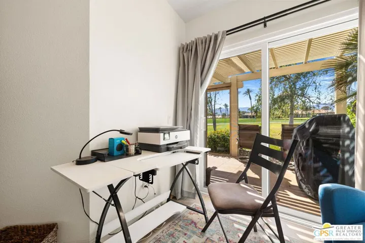 Introducing this beautifully updated and expanded Augusta model, ideally positioned just off the 1st green of a well-maintained 18-hole championship course, offering sweeping mountain, golf course, and clubhouse views. Thoughtfully designed with a cohesive open-concept layout, the great room showcases soaring vaulted ceilings, plantation shutters, custom window treatments, and a striking stacked stone fireplace, flowing seamlessly into an enlarged dining area.The kitchen blends style and functionality with granite countertops, stainless steel appliances, a glass tile backsplash, and soft-close custom cabinetry. It has also been fully upgraded along with all windows and doors throughout the home, enhancing both efficiency and comfort.Both bathrooms have been tastefully remodeled, including a reimagined primary suite bath featuring a walk-in shower. Tile flooring and skylights run throughout, creating a bright, airy atmosphere.Step outside to an extended patio with an Alumawood cover, thoughtfully designed with a raised section to maximize the views, along with electronic drop-down shades which is perfect for entertaining or unwinding while enjoying stunning desert sunsets.Offered tastefully furnished for a seamless move-in experience, this home is complete with an attached garage featuring epoxy flooring. The Palm Desert Resort Country Club has a beautiful clubhouse, Coachella Valley’s premier pickleball and tennis club, and an award-winning golf course. The resort is a very active community with a clubhouse (includes formal dining, a lounge, and a pro shop), and 20 pools and spas. This is an exceptional desert retreat combining comfort, quality, and location.