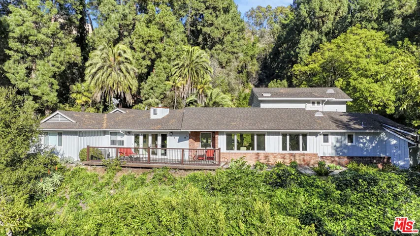 A must see! Gated in lower Bel Air, this unique, serene 3-acre property is tucked far back from the street by a long private drive. The large flat lawn, patio, and deck areas are surrounded by pine and citrus trees, offering a rare combination of total privacy, scale and natural beauty. The extensive outdoor patio entertaining area is equipped with heaters and fans, a built-in barbecue and refrigerator. The recently remodeled bright grand room and dining area has a fireplace, bar with wine refrigerator, and a 15-foot bifold glass door providing an expansive indoor-outdoor living feel. The kitchen is well equipped, including an indoor grill and warmer, and has an eating area that overlooks the lush backyard. The 1st floor primary en suite bedroom has a vaulted ceiling, jacuzzi bath, and private deck/garden. 3 additional bedrooms on the main floor plus a den area all have garden or canyon views. Upstairs is an additional large bedroom & bathroom, with potential use as a gym, studio, or guest room. The attached 2 car garage, with direct access to the home, has a work bench, storage loft, and 2 EV charging ports. There is additional parking for 5 cars within the gated area. The house is equipped with a security system and a sound system. The central heating and air conditioning systems, irrigation system, and electric gate can be controlled remotely. The property offers a convenient location to excellent schools, and is ideally located for easy access to UCLA, Beverly Hills, Santa Monica and the San Fernando Valley.
