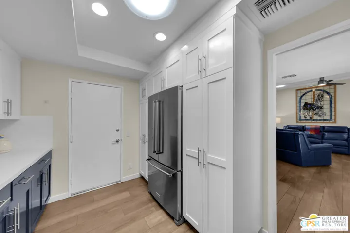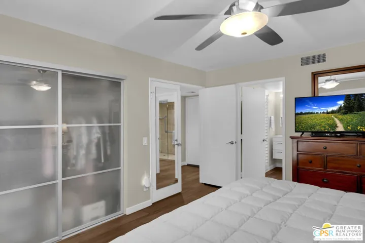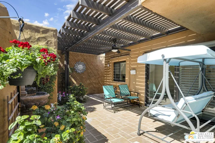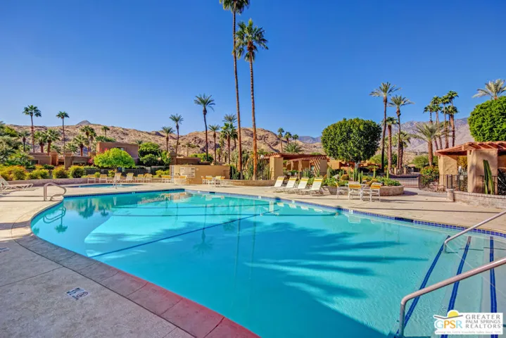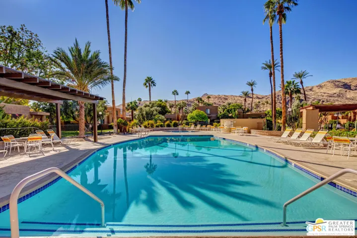 This is a very rare and desirable unit in Waverly Park because it has its own private entrance courtyard entrance with electronic gate entry located off of Birdie Way. This warm and inviting contemporary condo, recently remodeled and highly upgraded, has new porcelain floors throughout, a floor to ceiling stacked stone gas fireplace, wet bar, sophisticated bathrooms, an inviting private interior patio, ceiling fans, plantation shutters, frosted glass sliding doors in bedroom closets, dual glazed tinted vinyl windows, top of the line Dave Lennox series HVAC system (4 ton) unit with induction variable speed motor, a mini split HVAC in the primary bedroom and much more! There is an attached two car garage with direct kitchen access and ample storage. Gated Wavery Park is located in desirable South Palm Springs and is absolutely beautiful! There are three pools in addition to spas and tennis courts. Best of all this unit is on Fee land (that is land you own — no Indian Land Lease).